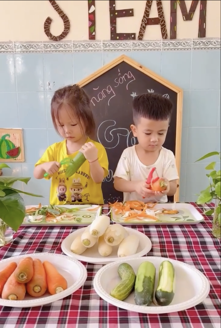 Các bạn nhỏ Chồi 1 với hoạt động rèn kỹ năng sống: Gọt rau củ, quả ạ.